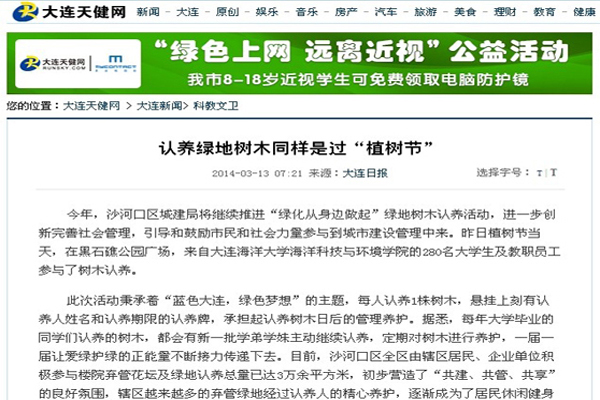3月13日,《大连日报》《大连晚报》《半岛晨报》、天健网等四家媒体分别以“认养绿地树木同样是过植树节”、“沙区绿地树木开始认养”、“沙区将对55条主次干路补绿 绿地树木认养启动”为题,报道我校海洋科技与环境学院与沙河口区城建局、黑石礁街道共同举办的植树节树木认养活动。