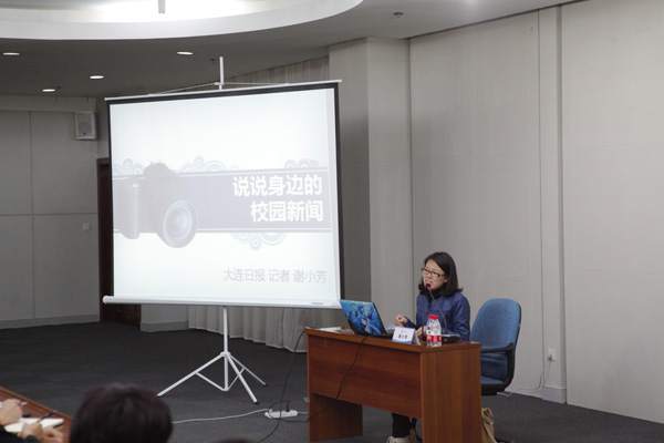 10月31日下午,由校党委宣传统战部主办的新闻工作培训会在图书馆多功能厅举行。《大连日报》文教部记者谢小芳女士应邀为我校各单位、部门新闻审核人、新闻通讯员、学生记者作了题为“说说身边的校园新闻”的讲座。活动由校党委宣传统战部副部长彭杰主持。