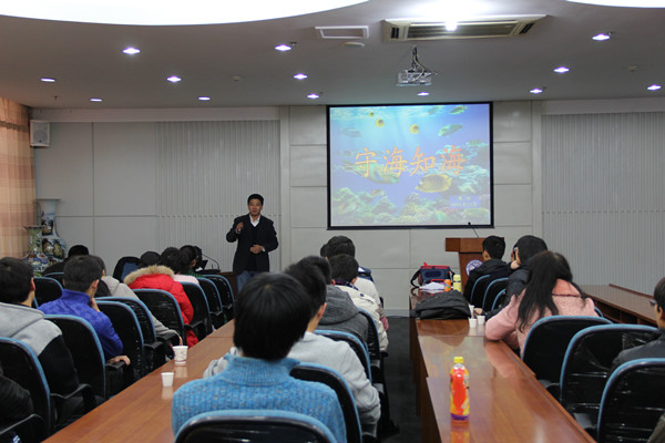 12月11日,由校工会主办的“幸福讲堂”在图书馆多功能厅举行。产业管理处处长周玮教授做客本期讲堂,为在场师生做了题为“守海知海”精彩讲座。讲座由校工会常务副主席姜涛主持。