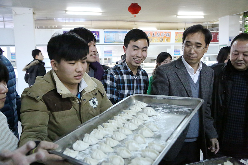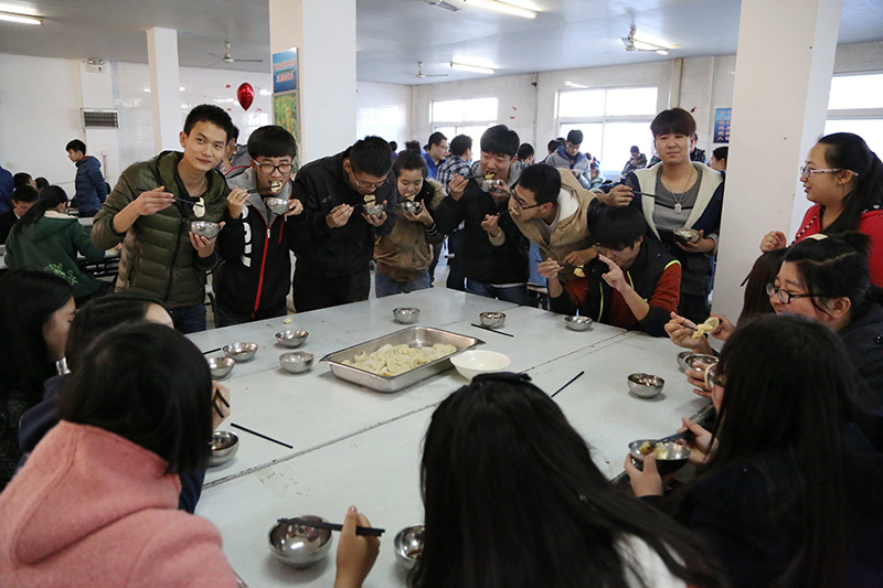 12月25日下午,在渤海校区食堂一楼,水产与生命学院院长常亚青、党总支书记班振威等学院领导、专业负责人、班导师、辅导员和教师代表与2014级5个专业11个班的240余名同学一起包饺子,欢度圣诞,迎接新年。