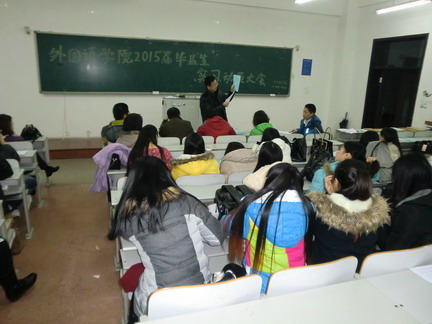 2015年1月5日下午,外国语学院在獐子岛108教室召开2015届毕业生实习就业动员大会。外国语学院副院长禹凤兰、各教研室主任和副主任、毕业班班导师、就业专干以及2015届毕业生参加了动员会。会议由党总支副书记吴鹏宇主持。