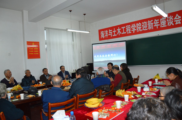 2014年12月30日,海洋与土木工程学院在学院二楼会议室召开离退休老同志座谈会。会议由党总支书记周永主持。学院离退休老领导、老教师,学院领导班子成员、在职教师代表、学院工会会员参加了会议。