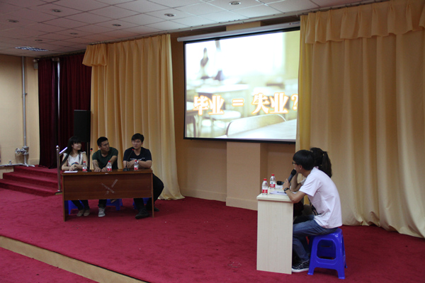 访谈中,嘉宾们介绍了自己找工作的经历和目前的就业状态,并就当前“毕业等于失业?”等热门话题展开讨论,对于目前的就业形势发表了各自的见解,分享了就业技巧和经验。胥子毅勉励大家要坚定自己的就业信念,借鉴他人的成功之路,找准就业方向;万事成建议大家学习时要全身心投入,工作时要积极锻炼,增强与人沟通交流的能力;厍淑琴强调要提升自信,工作中要注重培养团队合作和敢于担当的意识,现场同学认真倾听并记录。