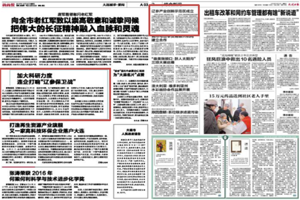 10月23日,《大连日报》A10版以“辽参产业创新示范区成立”为题、《新商报》A03版以“加大科研力度,连企打响辽参保卫战” 为题、《东方财富网》以公告的形式对我校与大连鑫玉龙海洋珍品股份有限公司举行合作揭牌仪式暨辽参产业创新示范区成立仪式进行了报道,《大连电视台》在晚间新闻时段播出了相关内容。