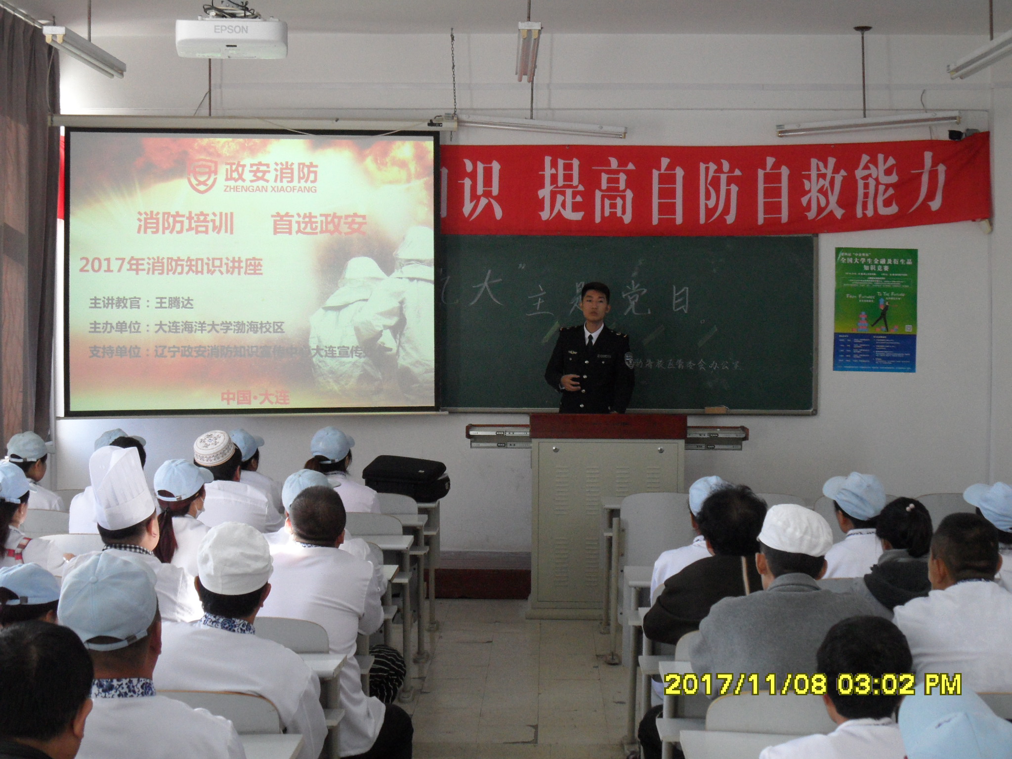 11月8日,办公室邀请到辽宁政安消防知识宣传中心大连宣传处专家王腾达,先后为渤海校区学生食堂、渤海校区物业工作人员开展了集中消防安全知识讲座。渤海校区学生食堂及物业共计100余名员工、渤海校区管委会办公室相关负责同志参加讲座。