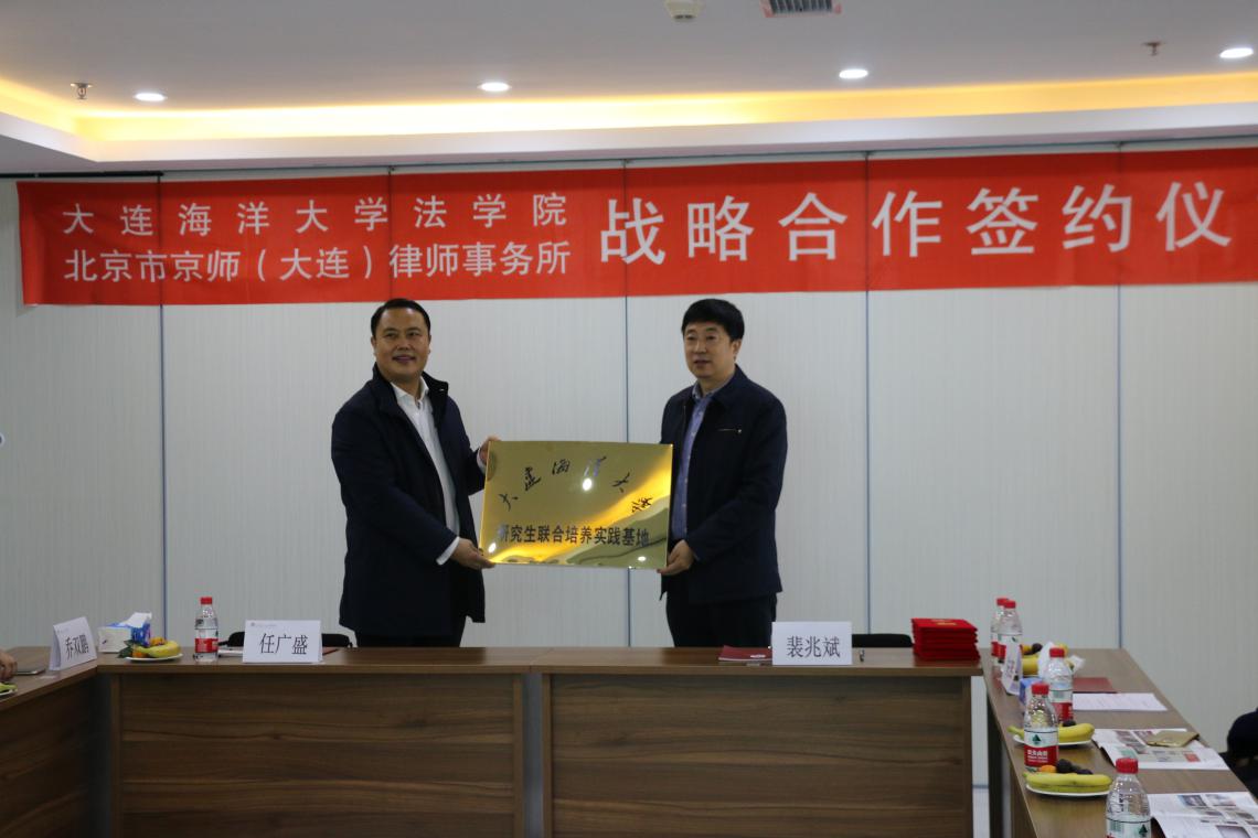 仪式上,裴兆斌和京师(大连)律师事务所主任任广盛同时为“研究生联合培养基地”和“大学生实践教育基地”揭牌。双方一致表示,今后将开展深入合作,为加强法律实务单位与法学教育、法学研究单位的合作,共同培养社会主义法治人才,构建法学实践教学体系,推进学术科研与实务的结合与发展贡献力量。