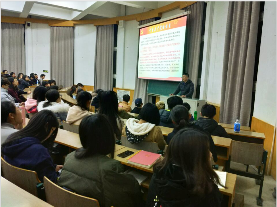 荆文涛根据新党章内容,向新生阐述了中国共产党的性质、发展过程、指导思想、最终奋斗目标以及现阶段的任务,同时就入党条件、入党动机和入党程序等内容做了详细介绍。他要求,学院新生要端正入党动机,加强理论学习,提高思想认识,积极靠近党组织。