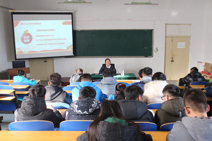吴卫卫以“学习党的十九大报告党章修改内容的解读”为主题带领与会成员共同学习党章。从党章修改背景、党章修改的具体方面、党章修改的重大影响三个角度入手,为党员和入党积极分子作出关于党章新修改的详尽解释,并带领同学们观看了央视微视频《公仆之路》。