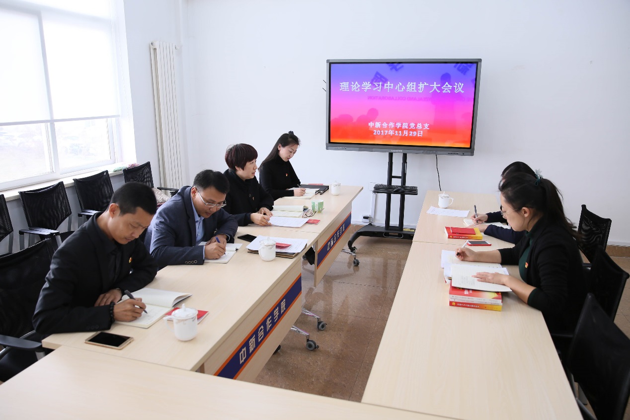 11月29日下午,中新合作学院党总支在会议室召开理论学习中心组(扩大)会议,传达学校党委理论学习中心组学习(扩大)会议精神,集中学习党的十九大精神。学院理论学习中心组成员、党支部书记、辅导员参加会议,会议由学院党总支副书记邓艺主持。