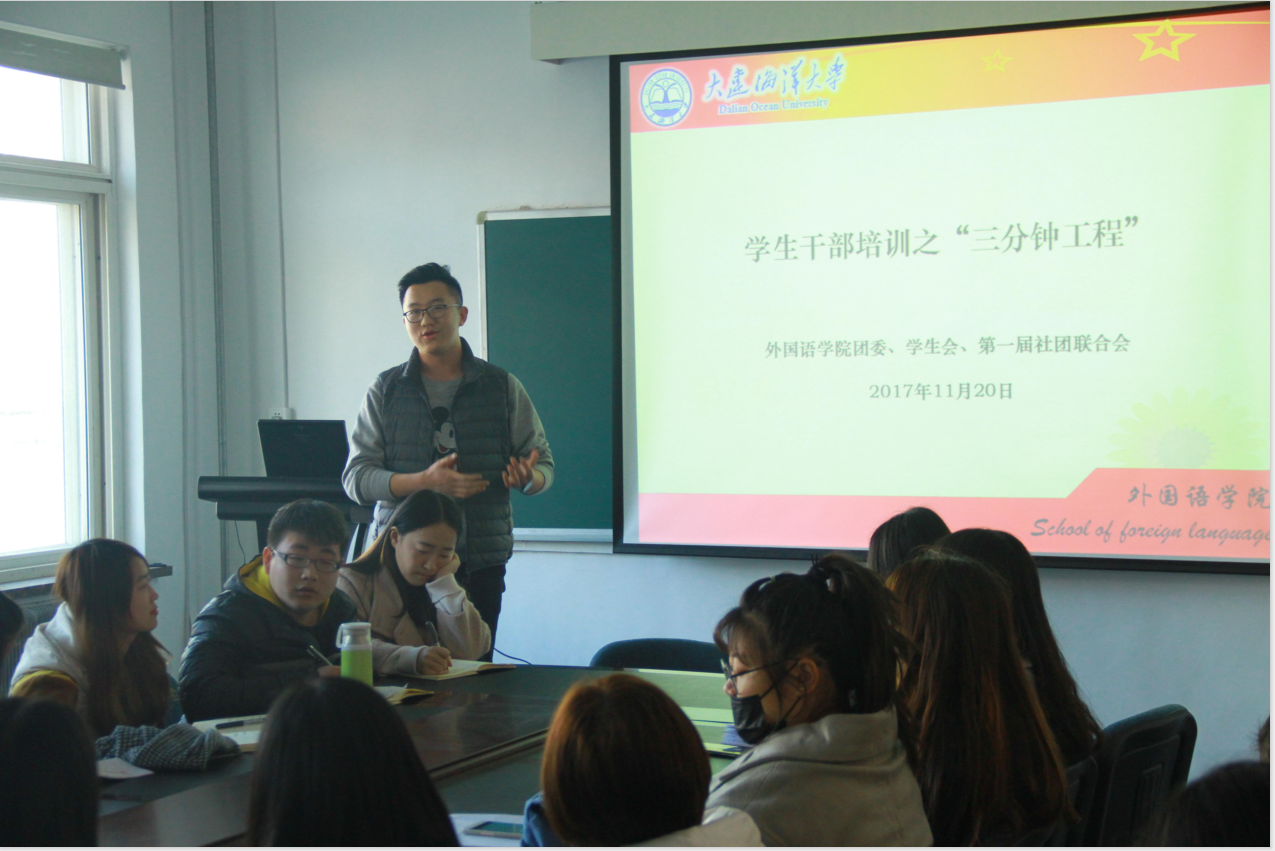 11月20日,外国语学院于一教206教室召开学生会例会及学生干部培训之“三分钟工程”演讲活动,学生会全体成员参加活动。活动由学生会主席宋蕾主持。