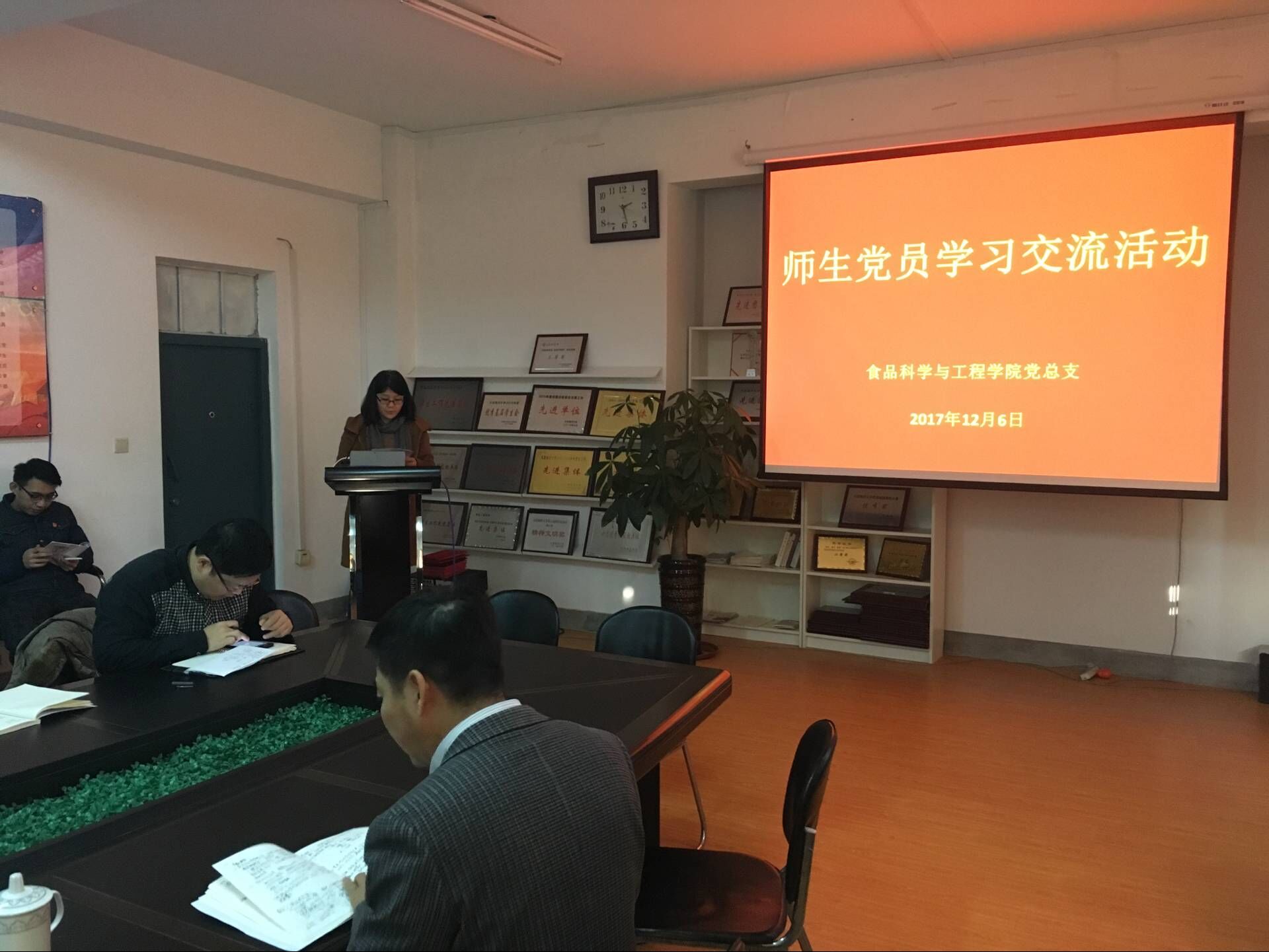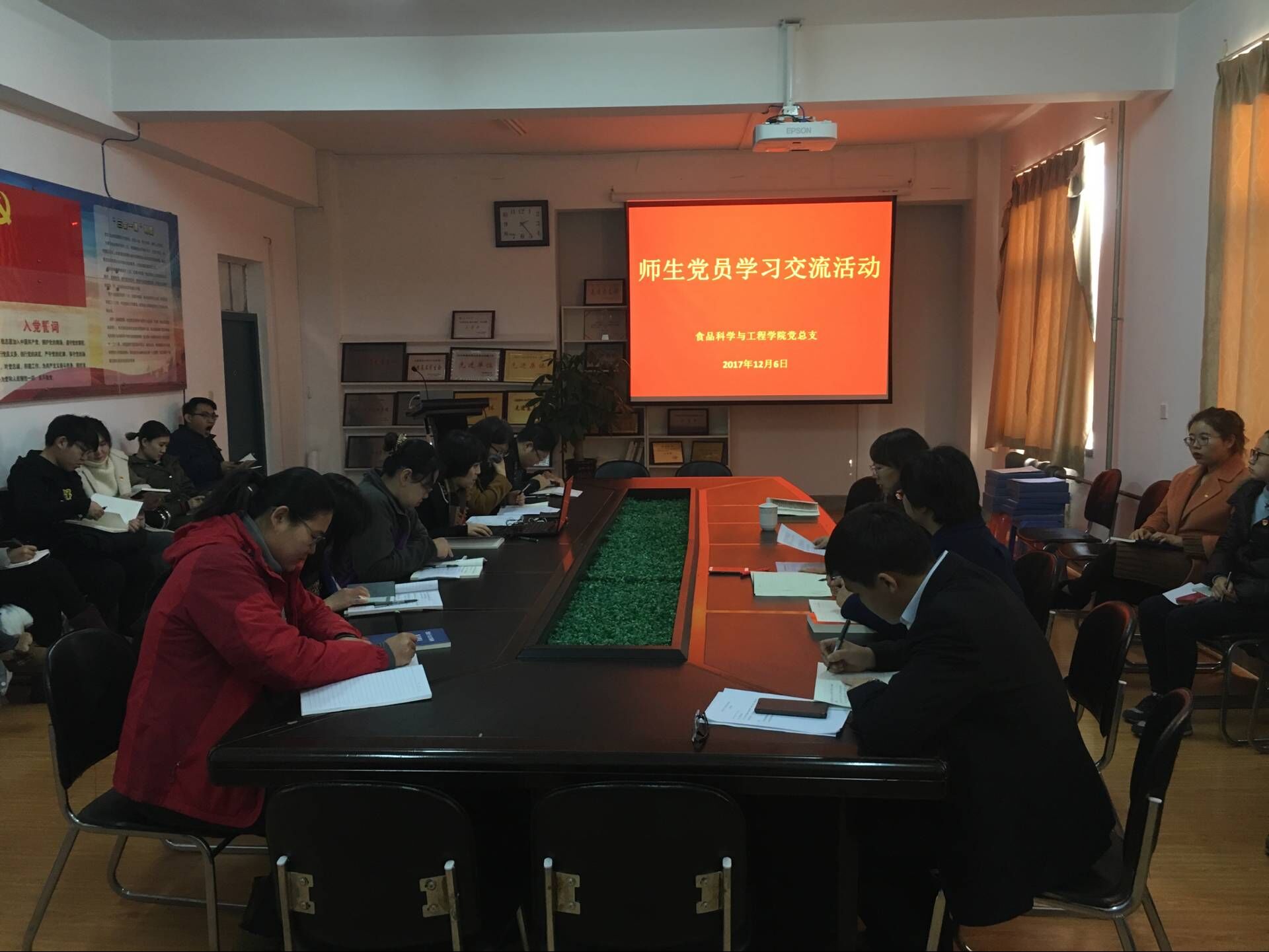 12月6日,食品科学与工程学院党总支在学院会议室举行“党纪条规、十九大报告学习交流”主题党日活动,学院教工支部、研究生支部、本科生支部全体党员参加活动。