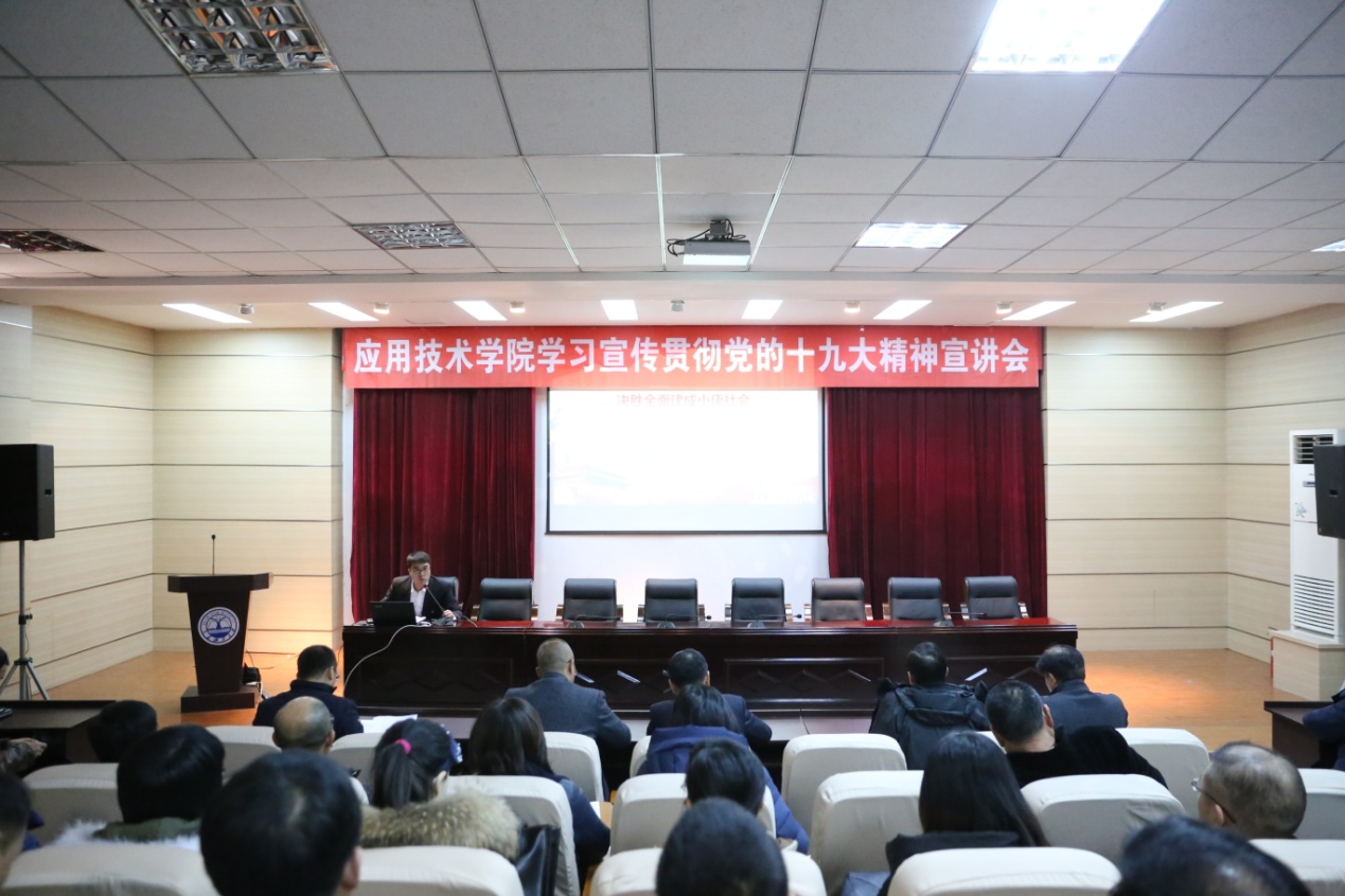 12月18日下午,我院在119报告厅召开党的十九大精神宣讲会,邀请校马克思主义学院教师刘一做了题为“决胜全面建成小康社会,开启全面建设社会主义现代化国家新征程”的宣讲报告。宣讲会由院党委副书记廉欢主持。学院领导、全体教职工、学生党员和非党积极分子代表参加宣讲会。
