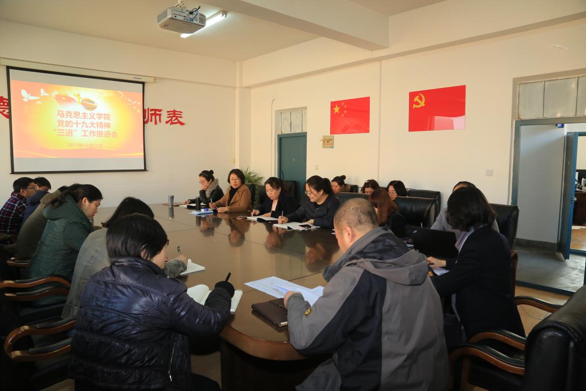 12月21日上午,马克思主义学院在会议室召开推进党的十九大精神“三进”工作专题会议,会议由学院院长王太海主持,学院领导班子成员和全体教师参加了会议。