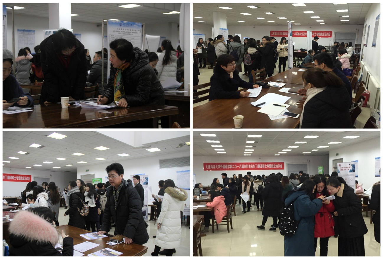 12月27日,外国语学院在文夫图书馆一楼召开了2018届本科生(英日语专业)及MTI翻译硕士(英语笔译方向)专场就业洽谈会。研究生学院相关领导,外国语学院领导班子成员、就业专干、毕业班班导师到现场调研指导,来自大连、北京、沈阳等地的42家企业参会。2017届离校未就业毕业生、2018届本科生和研究生以及大三学生共329名学生,共有60余人受到企业青睐,10余人被企业录用。
