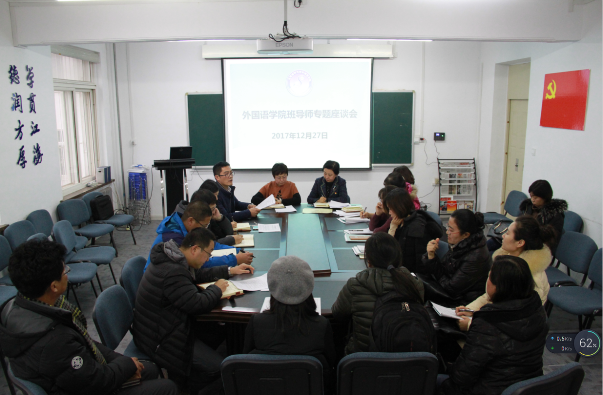 12月27日,外国语学院在1教206召开2017-2018学年第一学期班导师专题工作会议,学院领导班子成员和全体班导师参加。会议由总支书记范秀敏主持。