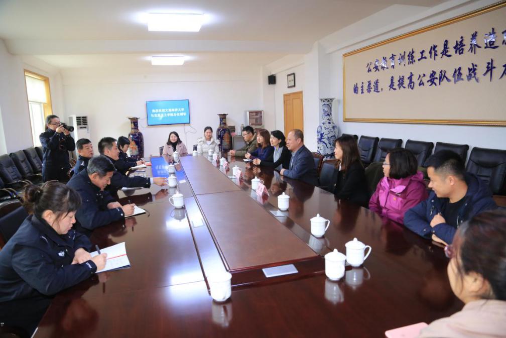 大连市公安局训练基地训练处领导班子热情接待了马克思主义学院一行。训练处处长刘香一首先发表了热情洋溢的欢迎词,肯定了双方在思想政治教育领域开展的深入合作,高度评价了我院教师赴基地进行十九大精神的宣讲工作,并介绍了基地在开展警员培训方面的相关经验。