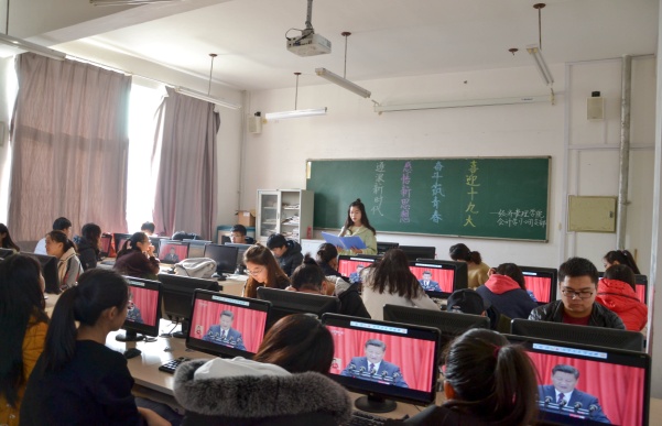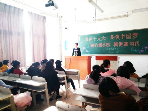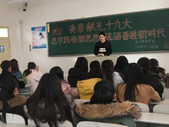 王欣然为团员青年们作“新时代、新思想、新使命、新征程”主题宣讲,深入讲解十九大的精神内涵与历史地位,同时对同学们提出期望,树立理想、坚定信念、付诸实践。农林经济管理2017团支部重温十九大开幕视频,认真学习习近平总书记重要讲话精神,并通过PPT案例展示,分享新时代优秀共产党员和优秀支教教师的先进事迹,激励同学们不忘初心,砥砺前行。会计学2017-2团支部学生代表通过“喜迎十九大”诗歌朗诵等形式,希望大家坚持读原著、学原文、悟原理,原原本本学习党的十九大精神。经济学2017团支部开展学习十九大精神主题知识竞赛,以喜闻乐见的形式,增强同学们对新时代新思想的理解与认同。其他支部团员青年也结合自己学习和生活实际,分享了学习党的十九大精神的心得体会,交流了如何用习近平新时代中国特色社会主义思想武装头脑、指导实践。最后,按照“三会两制一课”的规定,各支部结合组织生活会开展了团员年度教育评议。
