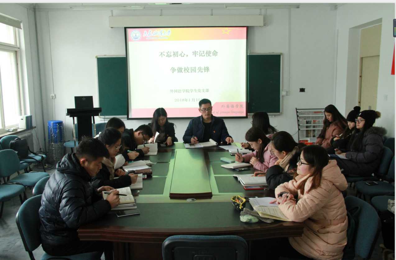 1月10日,外国语学院学生党支部在学院党员活动室组织召开主题党日活动,学生党支部书记王庆丰,组织员田源以及全体学生党员参加,会议由王庆丰主持。