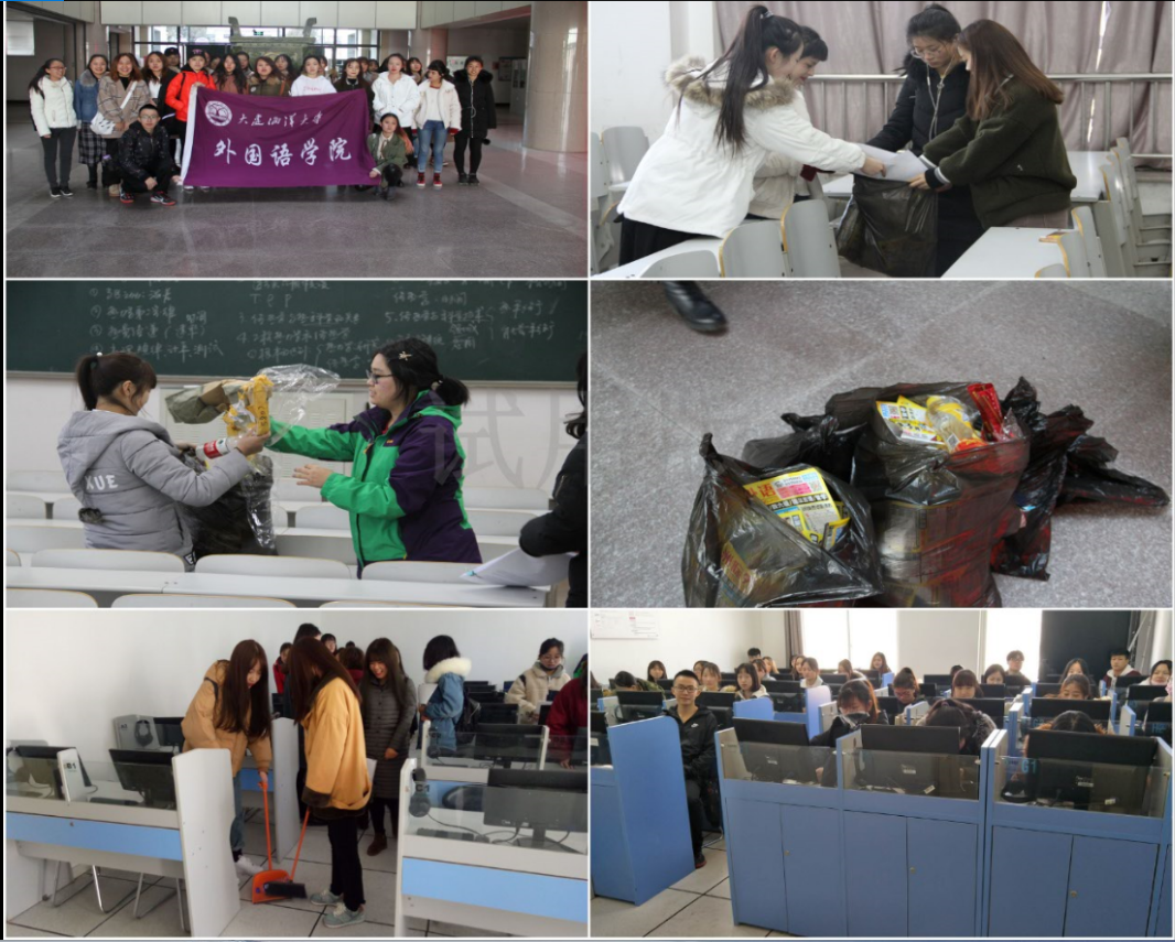3月5日,在学院社团联合会副主席孟頔的带领下,第八届团委学生会全体成员在獐子岛教学楼发起了“保卫獐子岛”—外国语学院雷锋日快闪活动。同学们认真清扫教学楼的走廊、教室和角落的垃圾,用实际行动传扬雷锋精神。英语2016-1和英语2016-2班两个团支部志愿组织班级全体同学在一教的语音室开展了卫生清扫工作,为新学期营造良好的学习环境提供了保障,用实际行动传递了雷锋精神。