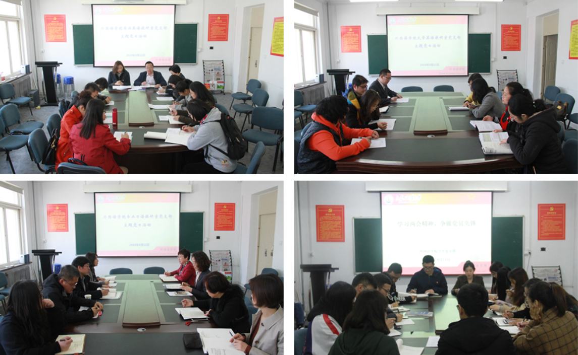 4月11日下午,外国语学院各党支部分别开展了主题党日活动。各党支部分别由支部书记主持学习了“两会”精神,并在支部内部结合实际工作开展了学习体会交流。
