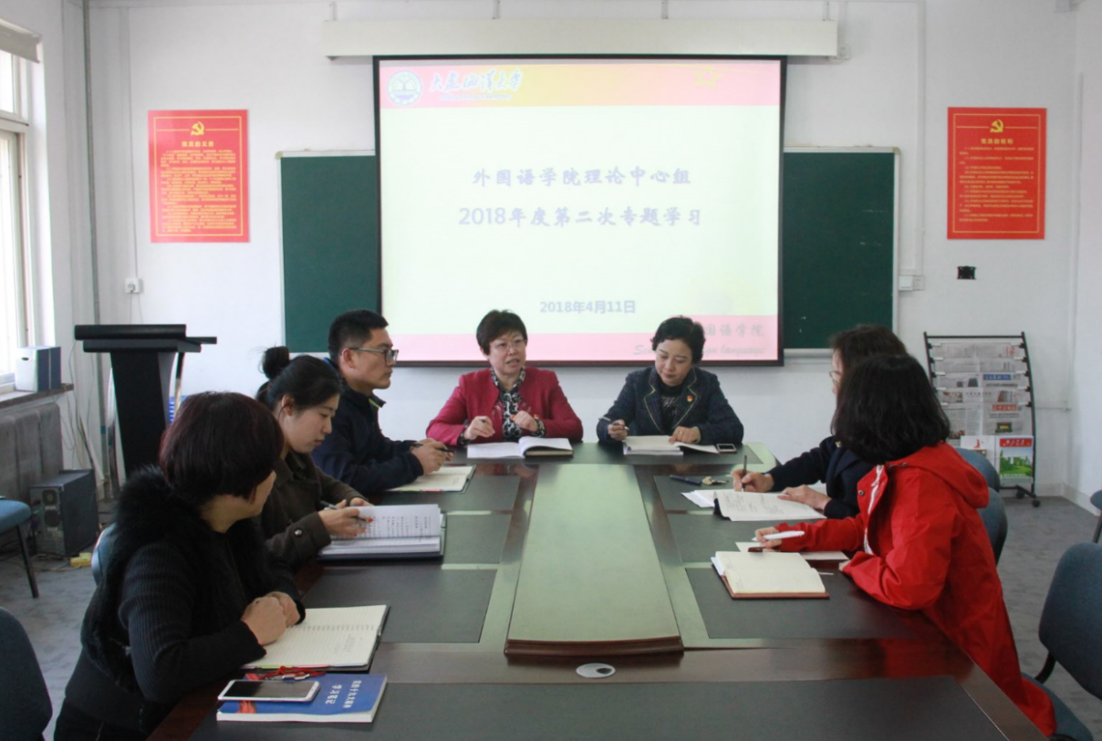 4月11日,外国语学院党总支理论学习中心组在党员活动室开展2018年度第二次专题学习,会议由学院党总支书记范秀敏主持,学院理论学习中心组成员参加了学习。