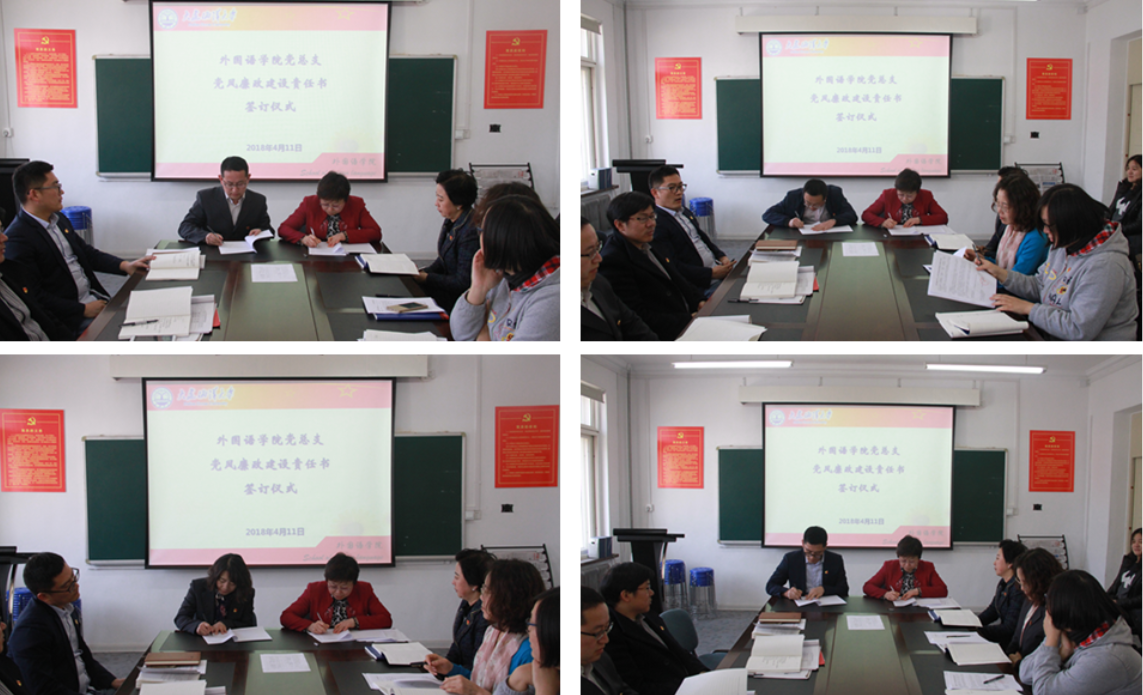 4月11日,外国语学院党总支召开教师党员大会,并举行了党风廉政建设责任书签订仪式,会议由总支书记范秀敏主持,全院教师党员出席。 会上,范秀敏首先向全院教师党员传达了2018年全省教育系统全面从严治党工作会议精神。她要求教师党员要认真学习并全面落实会议精神,在教师中带头做到“四个统一”。最后,范秀敏组织大家共同学习了“外国语学院党总支党风廉政建设责任书”的相关内容,并与4名支部书记现场签订了责任状。外国语学院 供稿