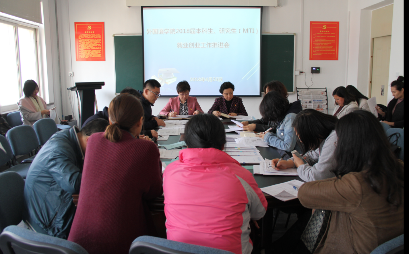 4月25日下午,外国语学院在一教206教师召开2018届本科生、研究生(MTI)就业创业工作推进会。学院领导班子、毕业班班导师、本科生论文指导教师、研究生导师以及就业专干出席会议。