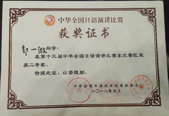 5月5日,由中国教育国际交流协会、日本经济新闻社和日本华人教授会议主办,教育部高等学校外国语言文学类专业教学指导委员会日语专业教学指导分委员会和中国日语教学研究会协办,吉林大学承办的“第十三届中华全国日语演讲比赛”东北赛区预赛在吉林大学东荣会议中心报告厅举行。我校外国语学院日语2016级1班学生郭一徽荣获二等奖。