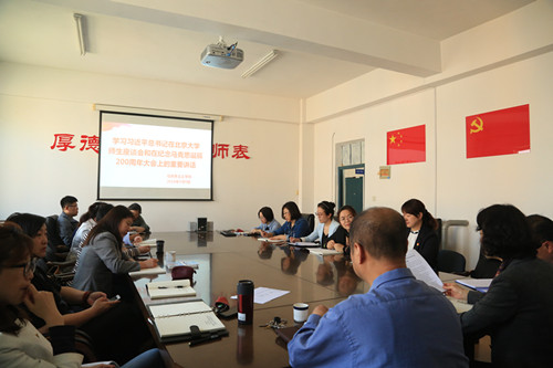 王太海要求全体党员教师要按照习近平总书记的讲话要求在学院内再次掀起一股研读马克思主义经典著作的热潮,同时将开展“纪念马克思诞辰200周年”系列活动,引领学院在学科建设、人才培养和教书育人的工作上再上新台阶。随后,全体党员教师以党支部为单位进行了研讨,大家纷纷畅谈了自己对习近平总书记两篇重要讲话的学习心得和体会。