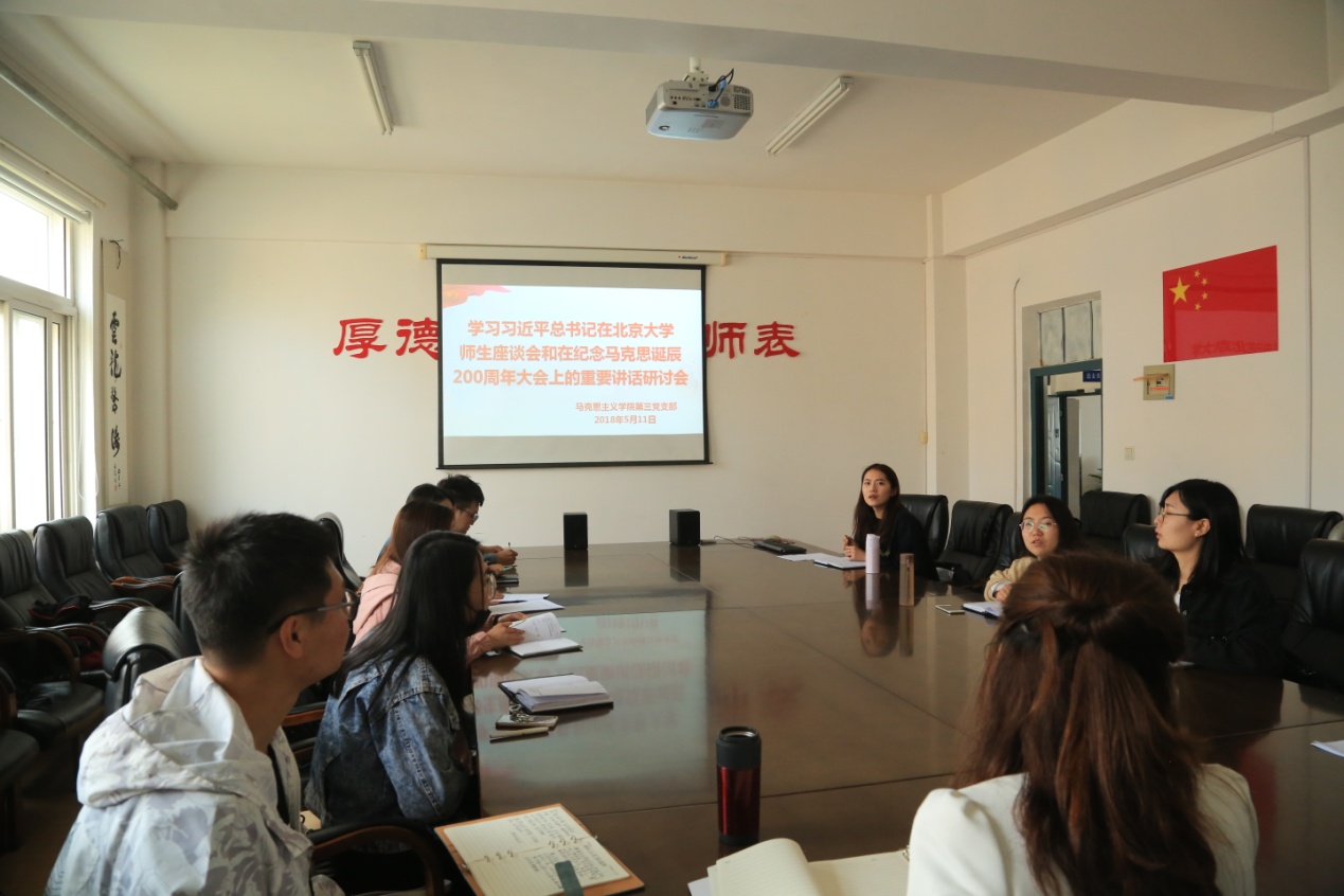 5月11日上午,马克思主义学院第三党支部在学院会议室召开学习习近平总书记在北大师生座谈会和纪念马克思诞辰200周年大会的重要讲话研讨会,会议由党支部书记郭双主持,全体硕士研究生党员和积极分子参加了本次会议。