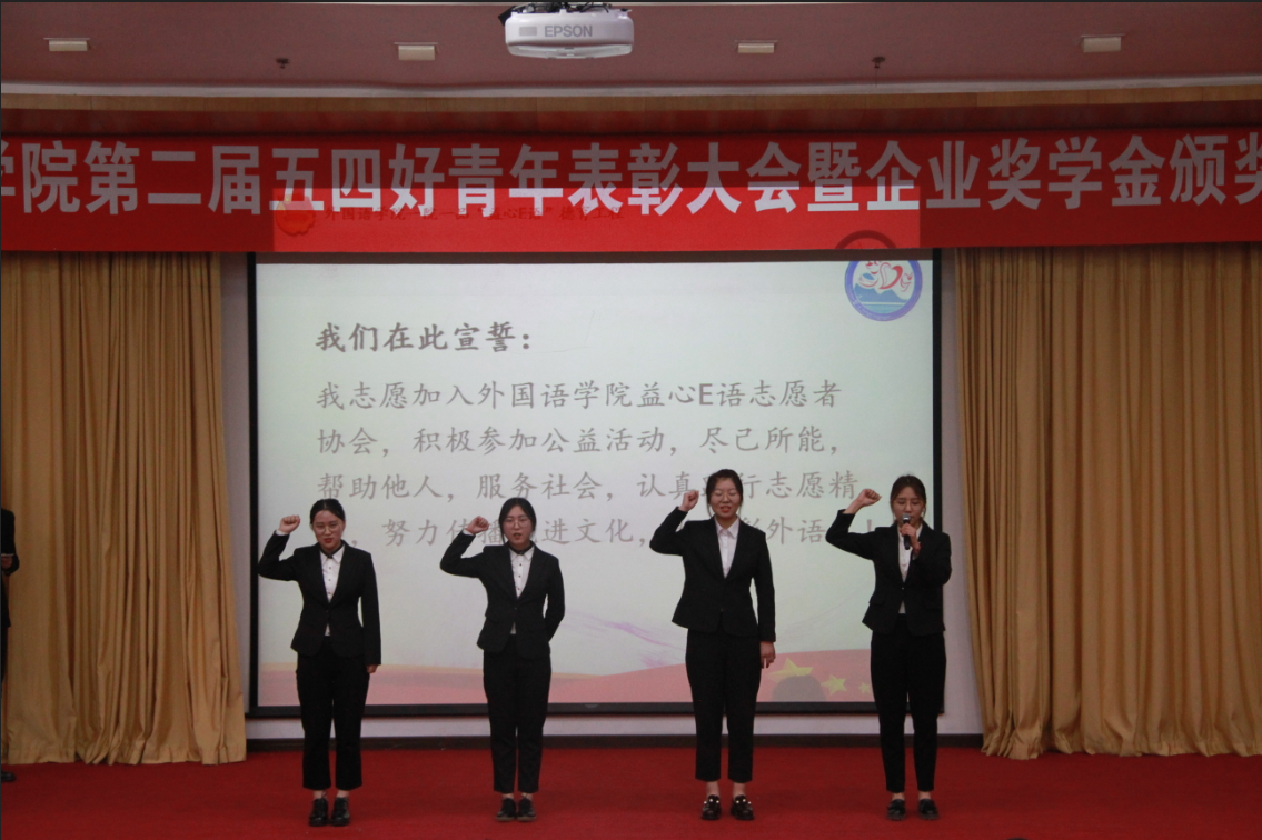 2017年暑假参加朝阳市唐杖子村支教的汪佳等4位同学应邀参会,她们与同学们分享了宝贵的朝阳支教经历,号召广大青年积极投身贫困地区开展教育扶贫工作,充分发挥大学生的光和热。同时学院2018年初组织成立的重点公益社团“E心益语”志愿协会作了工作汇报,陆洁等4位社团负责人进行了协会誓言宣誓,并表示力争将学院一院一品“E心益语”德育工程做得更好!