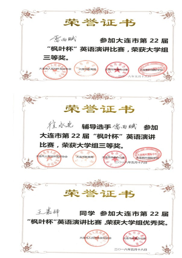 近日,由大连市外事办公室、大连市人民对外友好协会、大连市教育局、大连枫叶教育集团联合举办的大连市第22届“枫叶杯”英语演讲比赛复赛在大连日航饭店举办。我校外国语学院2017级学生雷雨赋荣获大赛三等奖,外国语学院2016级学生王嘉驿荣获优秀奖,专业英语教研室主任崔永光荣获优秀指导教师称号。
