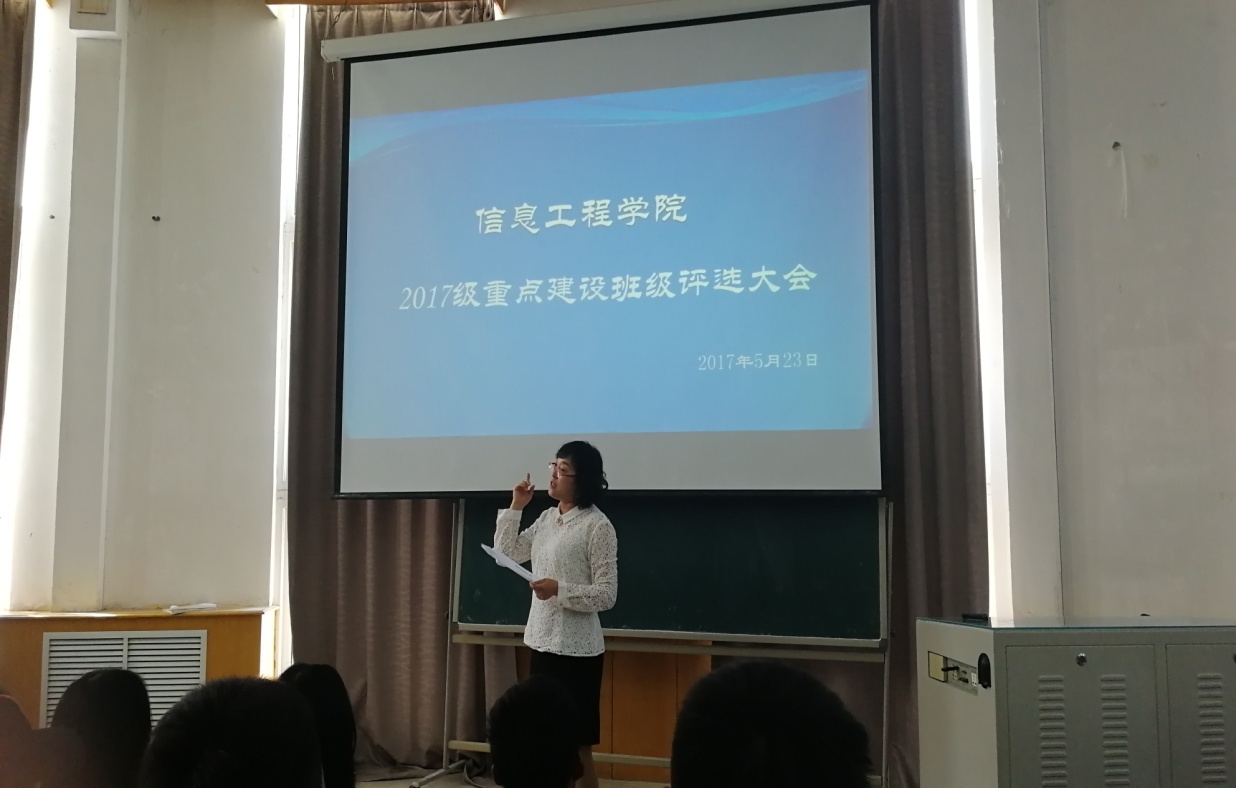 5月23日,信息工程学院在渤海校区第三阶梯教室举行2017级重点建设班级评选大会。党总支副书记范庆华、学生工作人员及2017级全体学生参加评选会。