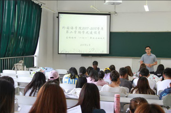 6月8日中午,外国语学院在獐子岛教学楼110教室举行2017-2018学年第二学期学风建设月暨雷锋榜样“一对一”帮扶启动仪式。学院党总支副书记武家春、团委书记王庆丰,2015、2016级各班级学习委员、学院雷锋榜样共70余名学生参加。