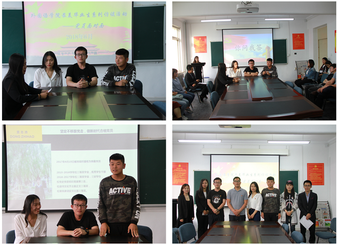 近日,外国语学院在第一教学楼206教室举办了第三届优秀毕业生系列活动之党员面对面活动。学生党支部书记王庆丰,2018届优秀毕业生党员付晓晨、潘森、董志浩,拟发展对象及积极分子共60余人参加活动。