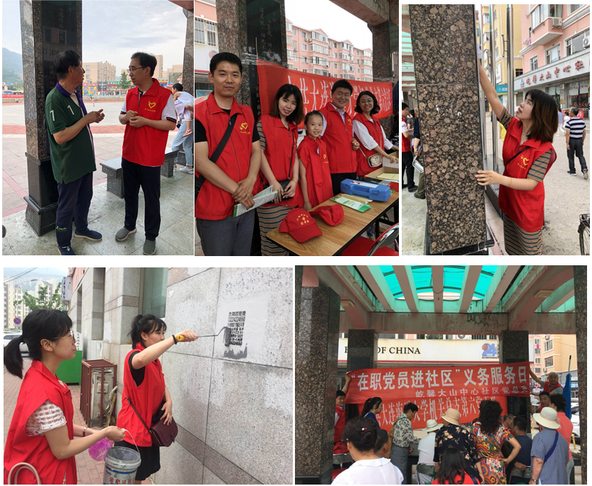 党员们穿上志愿服务红马甲,联系居民,服务群众。活动现场,在职党员开展大连海洋大学招生咨询、发放食品安全工具包、民法手册,解答居民的疑问;拿起工具,清理大山广场文化长廊、粉刷楼梯外广告,还居民一个洁净的空间;与屹馨大山中心社区工作人员一起,走访困难党员,把党的关怀带到社区每一个角落。