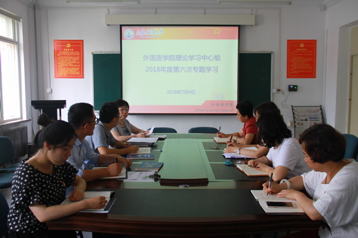 7月4日下午,外国语学院在党员活动室召开理论学习中心组2018年度第六次专题学习会议,理论学习中心组全体成员参加学习,会议由党总支书记范秀敏主持。
