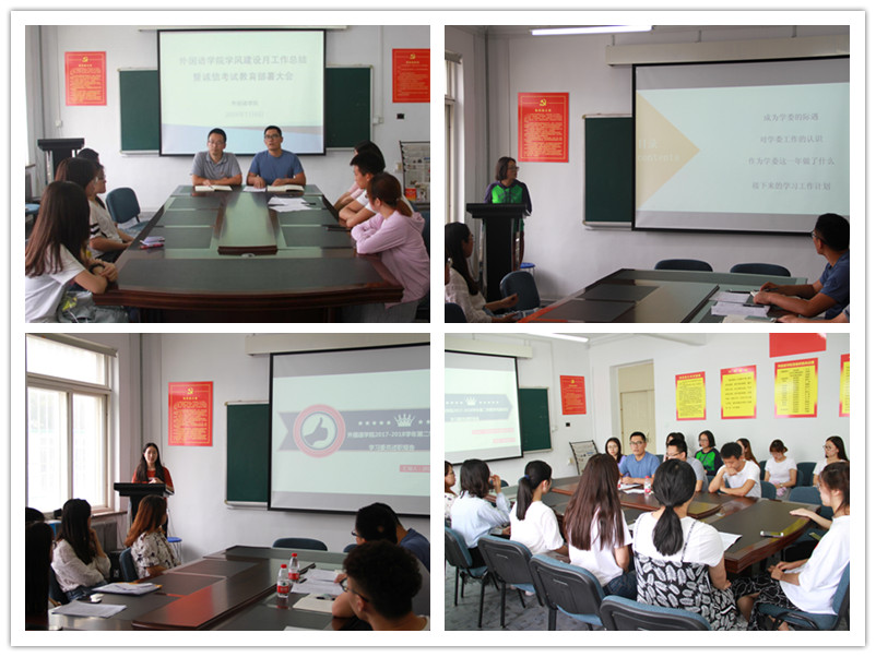 王庆丰结合《外国语学院学风月建设工作方案》对本学期的学风月工作进行了总结,对各班级录制的“诚信考试视频”给予了高度赞扬,他对即将到来的期末考试工作进行了认真部署,要求各班级认真召开诚信教育主题班会,杜绝作弊行为。
