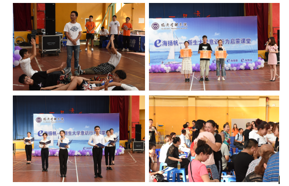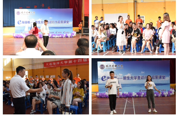 课堂由“开篇”“热身”“破冰”“生活与感恩”“深入训练”和“结课”六个部分组成。精心制作的开篇音频,带领全体新生和新生家长畅游渤海校区,对学院历史、教师风采及院系特色活动有了初步了解。伴随着2017级学长学姐热情奔放的现代舞和民族舞表演,活动正式拉开序幕。“新生采访”和“黄金掌声”环节着重培养新生的专注力和团队合作精神;幽默风趣、各具特色的“自我介绍”,不仅锻炼同学们的自我营销和自我表现力,同时增进彼此了解,活跃现场氛围。