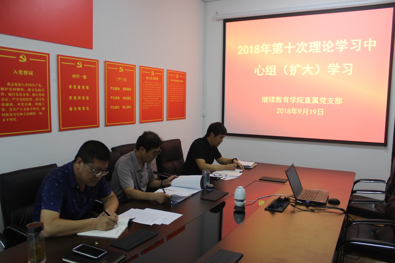 9月19日,继续教育学院直属党支部在渤海校区学院会议室召开2018年第十次理论学习中心组(扩大)专题学习会议。学院理论学习中心组全体成员、组织员参加了会议。会议由直属党支部书记纪元东主持。