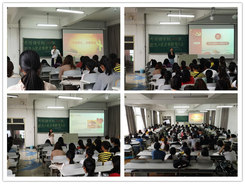 为深入学习宣传贯彻习近平新时代中国特色社会主义思想和党的十九大精神,抓好新生入党启蒙教育工作,9月19日,外国语学院在渤海校区二教202教室召开2018级新生入党启蒙教育大会。学院团委书记王庆丰、2015级学生党员宋蕾、袁天旭、曲悦桐以及全体2018级新生参加。