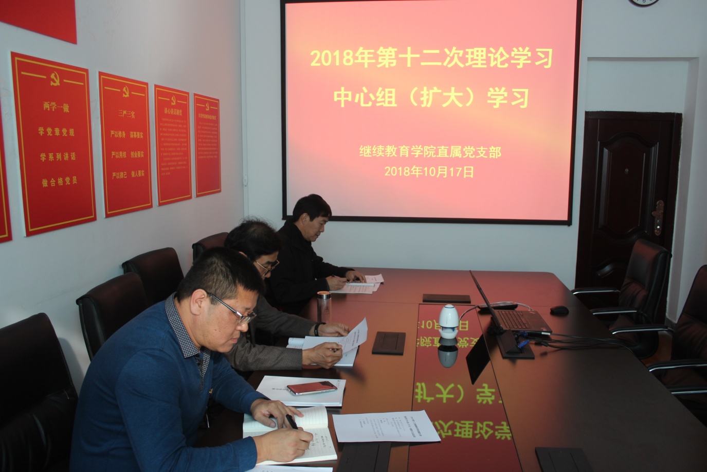 10月17日,继续教育学院直属党支部在渤海校区学院会议室召开2018年第十二次理论学习中心组(扩大)专题学习会议。理论学习中心组全体成员、组织员参加了会议。会议由直属党支部书记纪元东主持。