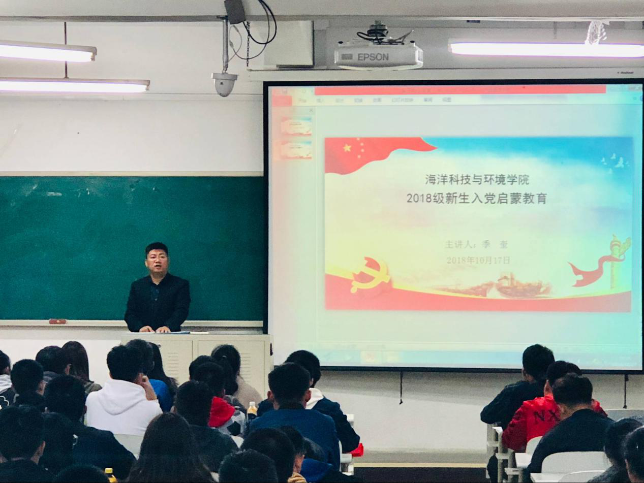 10月17日,海洋科技与环境学院在渤海校区2教202举办了新时代党员群众讲习所第三讲暨2018级新生入党启蒙教育讲座活动。讲座由学院党总支副书记季奎主持,2018级全体学生参加活动。