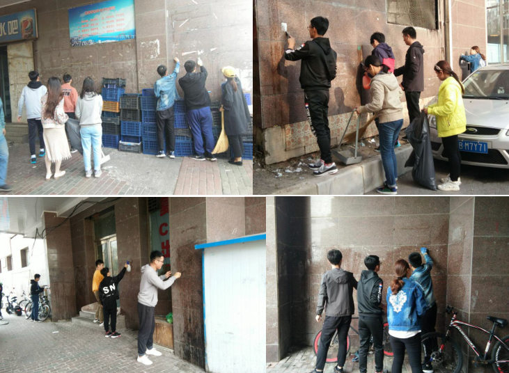 在活动中,公寓学生会成员克服了野广告密、碎、粘贴牢固的种种困难,采取了分片清理、责任到组的工作模式,认真高效的完成了工作。本次活动持续了两个半小时,大家分工明确,采用铲子、钢丝球、手撕等方法清除广告,小组后勤人员也及时完成了清扫、擦拭楼体墙面等善后工作。公寓学生会全体成员付出了辛勤的汗水,营造了焕然一新的公寓环境。