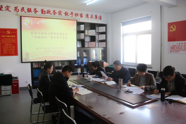 11月1日,航海与船舶工程学院党总支在学院党员活动室召开“不忘初心、牢记使命”主题教育理论学习中心组会议。开展“师德师风大学习、大讨论”专题学习研讨,会议由学院党总支书记李俊柱主持,学院党总支委员参加会议。