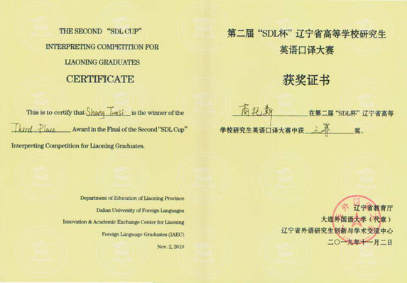 11月2日,由辽宁省教育厅主办,辽宁省外语研究生创新与学术交流中心和大连外国语大学承办的首届“SDL杯”辽宁省高等学校研究生英语口译大赛在大连举行。来自大连理工大学、东北大学、大连外国语大学等近二十所省内高校的81名硕士研究生参加了比赛。