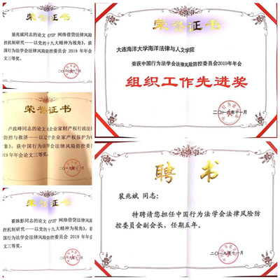 会议颁奖环节,我校海洋法律与人文学院荣获年会论文组织工作先进奖,《北极航线开发风险防范与应对研究》《P2P网络借贷法律风险防控机制研究——以党的十九大精神为视角》《社区矫正立法研究》《“一带一路”背景下企业法律风险防控》《“一带一路”背景下企业对外投资法律风险的防范》《“一带一路”视域下港口企业对外投资法律风险防范》《“一带一路”视角下企业PPP模式政治风险的法律预防》《企业家财产权行政法律风险防控与救济——以辽宁企业家产权保护为研究对象》等8篇论文被收录论文集,其中裴兆斌、翟姝影撰写的《P2P网络借贷法律风险防控机制研究——以党的十九大精神为视角》、卢政峰撰写的论文《企业家财产权行政法律风险防控与救济——以辽宁企业家产权保护为研究对象》获得了年会优秀论文三等奖。