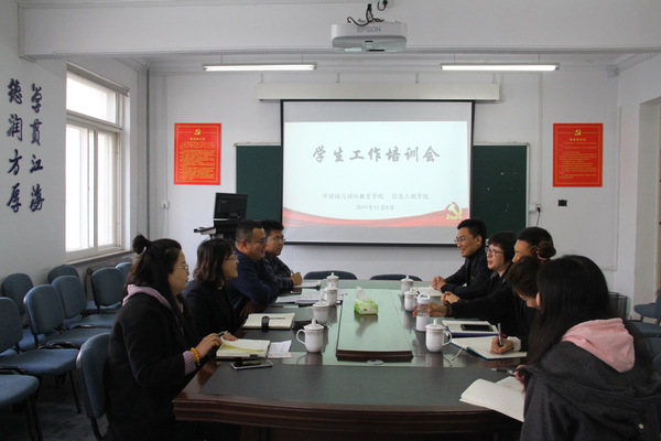 11月8日上午,外国语与国际教育学院和信息工程学院在1教206会议室联合召开学生工作培训会。信息工程学院党总支副书记范庆华、团委书记王建东、辅导员范晓旭、范治慧受邀参会。外国语与国际教育学院党总支书记邓艺、党总支副书记孙祥山、团委书记周宇颂及辅导员孟美斯、田源参加会议。会议由孙祥山主持。