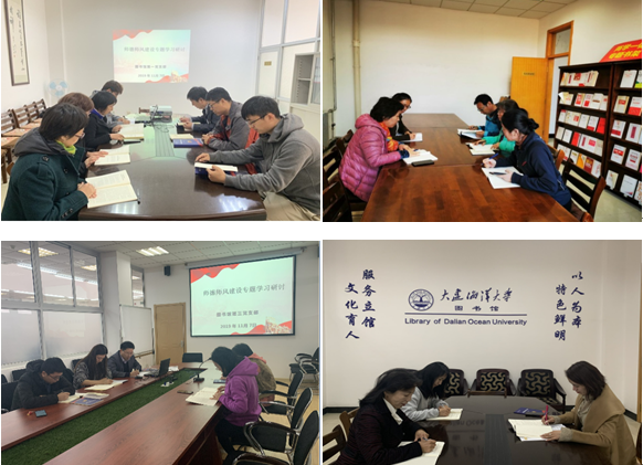 活动开展过程中,各支部主要围绕《大连海洋大学师德师风学习资料》,集体学习了习近平总书记关于教育的重要讲话和指示精神、《教育部关于建立健全高校师德建设长效机制的意见》《新时代高校教师职业行为十项准则》《做党和人民满意的好老师》《高等院校教师职业道德规范》《高等学校预防与处理学术不端行为办法》《大连海洋大学关于加强和改进师德师风建设工作的实施意见》等文件内容,开展学习研讨。