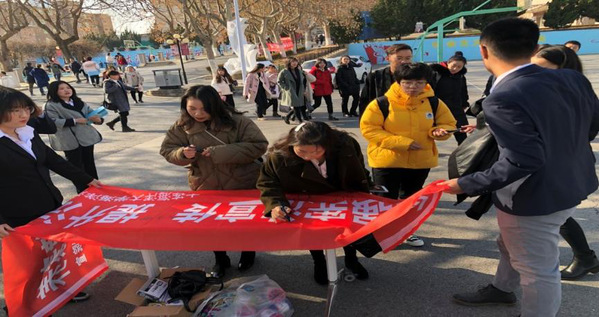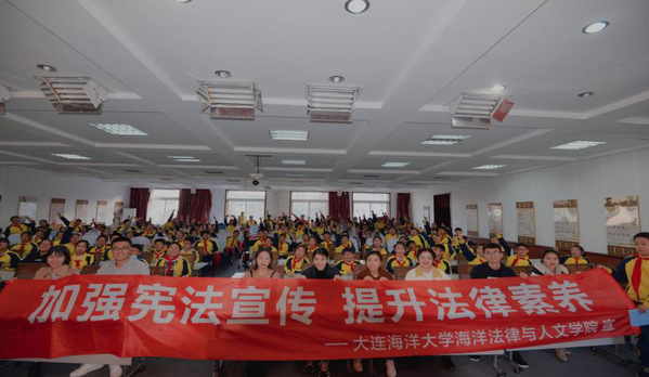 海洋法律人文学院的志愿者们在校园内向师生发放宪法知识宣传册、开展宪法知识咨询、组织在“加强宣传、提升法律素养”宣传条幅签字,“宪法日”的大连海洋大学校园内到处可见普法宣传志愿者们的身影。